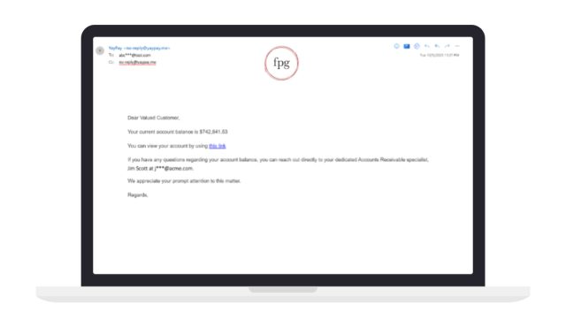 Receive your email from YayPay with your unique link and security verification code to access your payment portal.