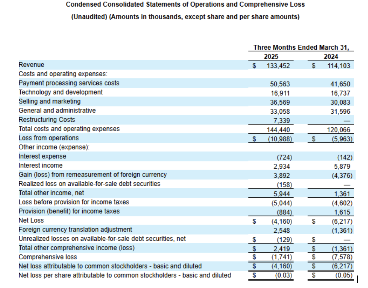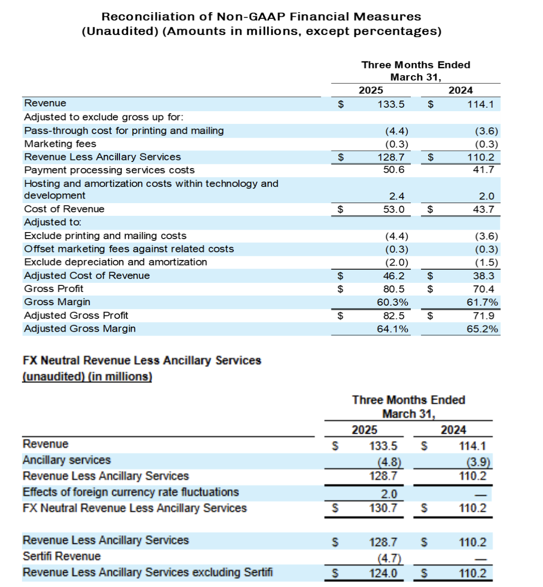 - Revenue Less Ancillary Services increased 16.8% to $128.7 million in the First quarter of 2025, compared to $110.2 million in the First quarter of 2024. On an FX-neutral basis, Revenue Less Ancillary Services increased 18.6% year-over-year. Excluding Sertifi, Revenue Less Ancillary Services increased 12.6% year over year to $124 million or 14.4% year over year on an FX-Neutral basis in the First quarter of 2025.