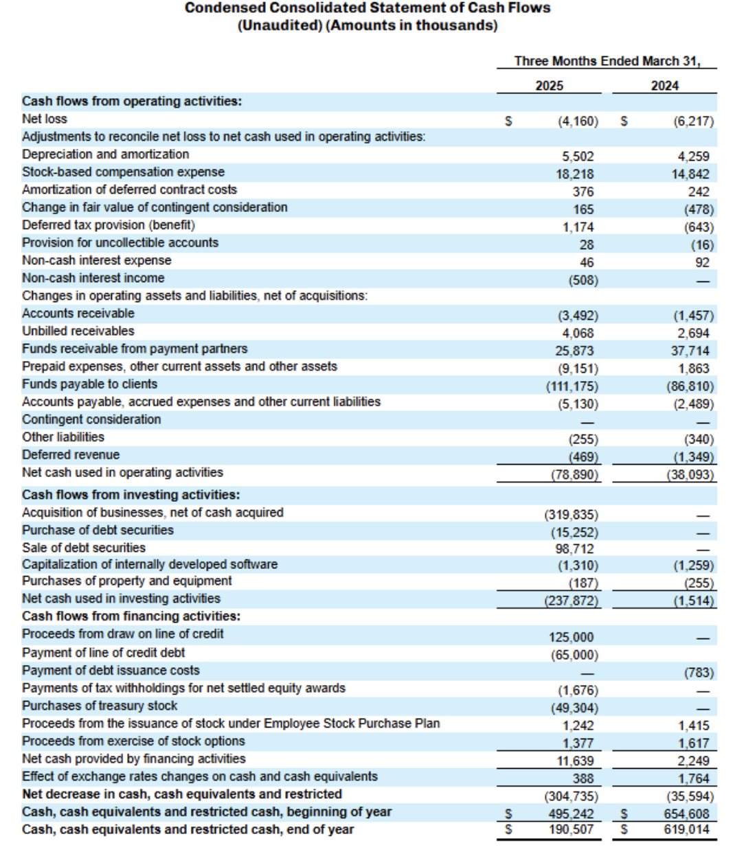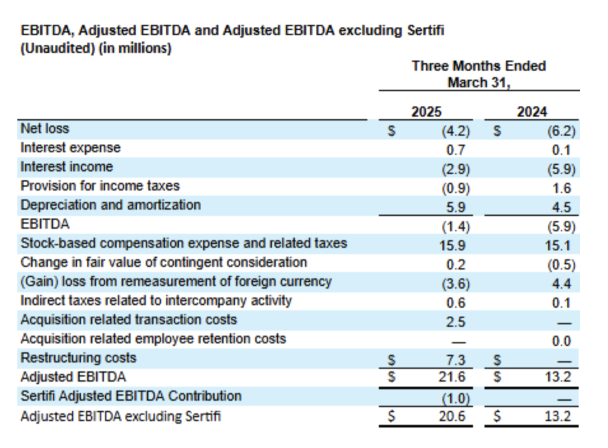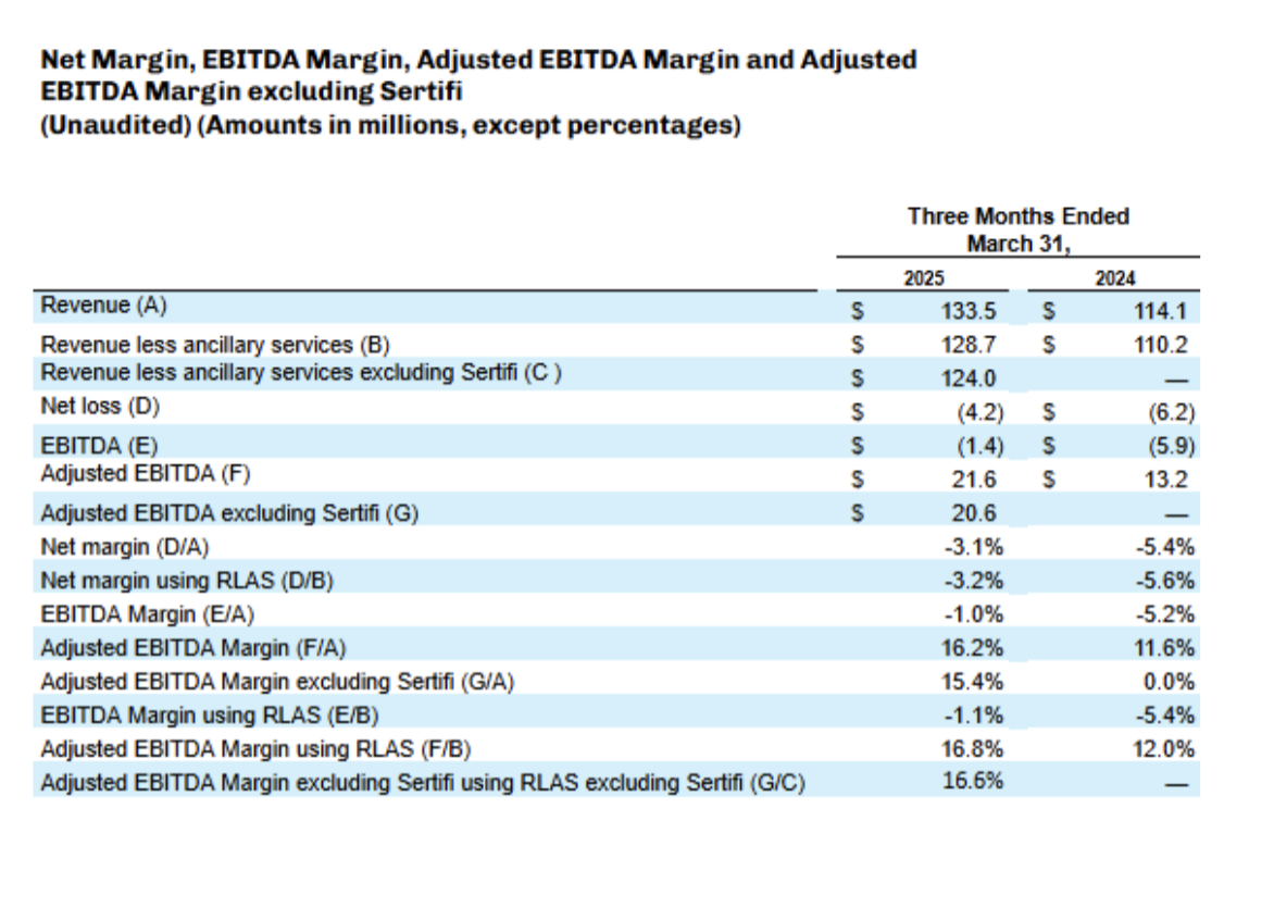 - Adjusted EBITDA increased to $21.6 million in the First quarter of 2025, compared to $13.2 million in the First quarter of 2024. Our adjusted EBITDA margins increased 476 bps year-over-year to 16.8% in the First quarter of 2025. Excluding Sertifi, adjusted EBITDA was $20.6 million compared to $13.2 million in the First quarter of 2024.