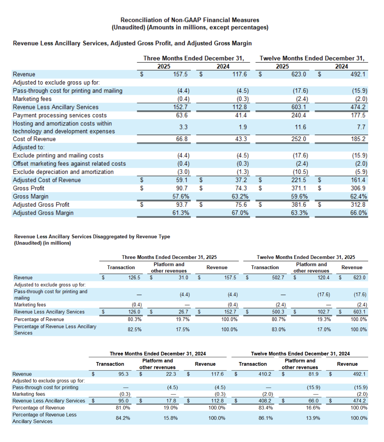 • Revenue Less Ancillary Services. Revenue Less Ancillary Services represents the Company’s consolidated revenue in accordance with GAAP less (i) pass-through cost for printing and mailing services and (ii) marketing fees. The Company excludes these amounts to arrive at this supplemental non-GAAP financial measure as it views these services as ancillary to the primary services it provides to its clients.