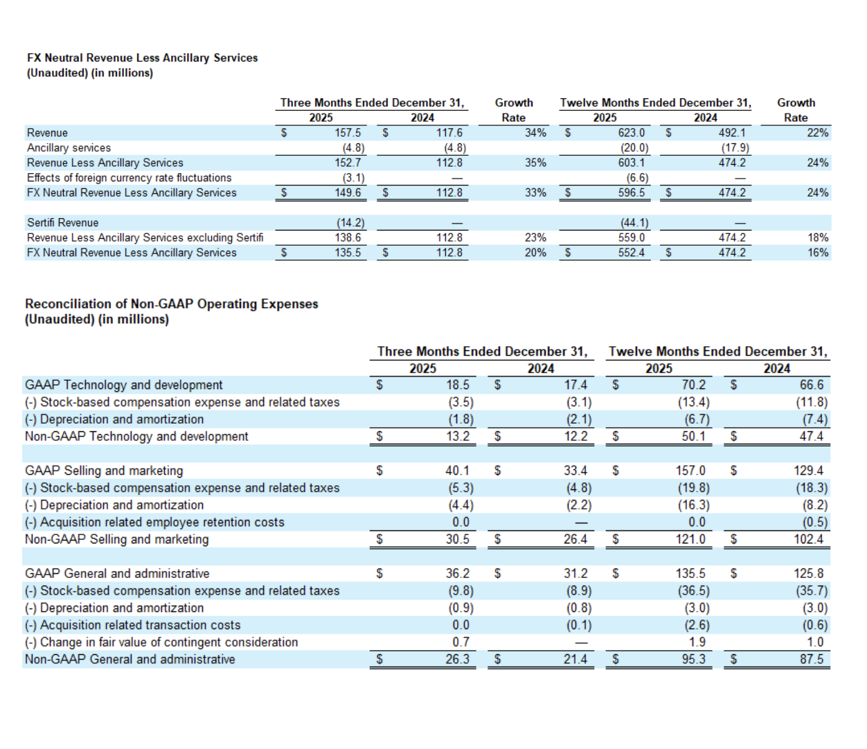 • Revenue Less Ancillary Services increased 35.3% to $152.7 million in the Fourth quarter of 2025, compared to $112.8 million in the Fourth quarter of 2024. On an FX-neutral basis, Revenue Less Ancillary Services increased 32.6% year-over-year. Excluding Sertifi, Revenue Less Ancillary Services increased 22.8% year over year to $138.6 million or 20.1% year over year on an FX-Neutral basis in the Fourth quarter of 2025.