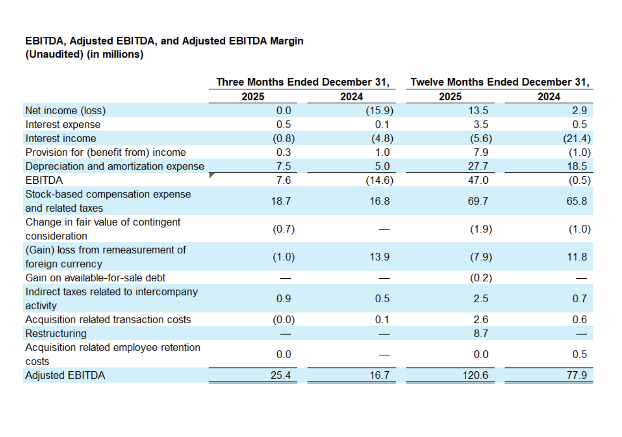 • Adjusted EBITDA. EBITDA represents our consolidated net income (loss) in accordance with GAAP adjusted to exclude (i) interest expense, (ii) interest income, (iii) provision for (benefit from) income taxes and (iv) depreciation and amortization. Adjusted EBITDA represents EBITDA further adjusted by excluding (a) stock-based compensation expense and related payroll taxes, (b) the impact from the change in fair value measurement for contingent consideration associated with acquisitions,(c) gain (loss) from the remeasurement of foreign currency, (d) indirect taxes related to intercompany activity, (e) acquisition related transaction costs, (f) employee retention costs, such as incentive compensation, associated with acquisition activities, (g) restructuring costs, and (h) gain (loss) from investments. Management believes that the exclusion of these amounts to calculate Adjusted EBITDA provides useful measures for period-to-period comparisons of the Company’s business.