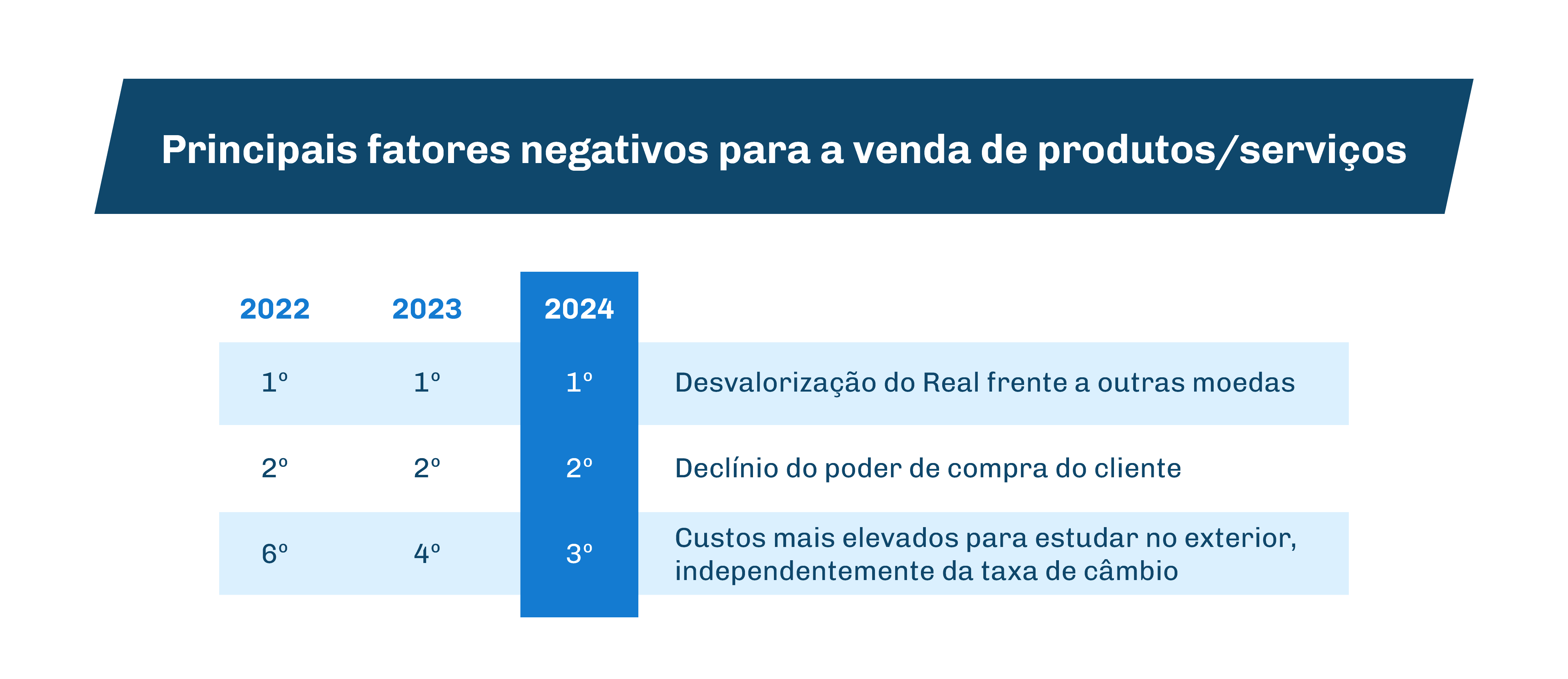 De acordo com o relatório da BELTA, o investimento médio feito por clientes que desejam estudar no exterior é de US$ 7.238, mais de dez vezes a renda média anual no Brasil. Além disso, apesar de mais da metade dos estudantes pesquisados serem da região mais rica do país, as questões financeiras ainda impactam a capacidade dos agentes de vender cursos. Os três principais desafios que eles enfrentam são a desvalorização do Real, a queda do poder de compra e o custo mais alto da educação no exterior, independentemente das taxas de câmbio.