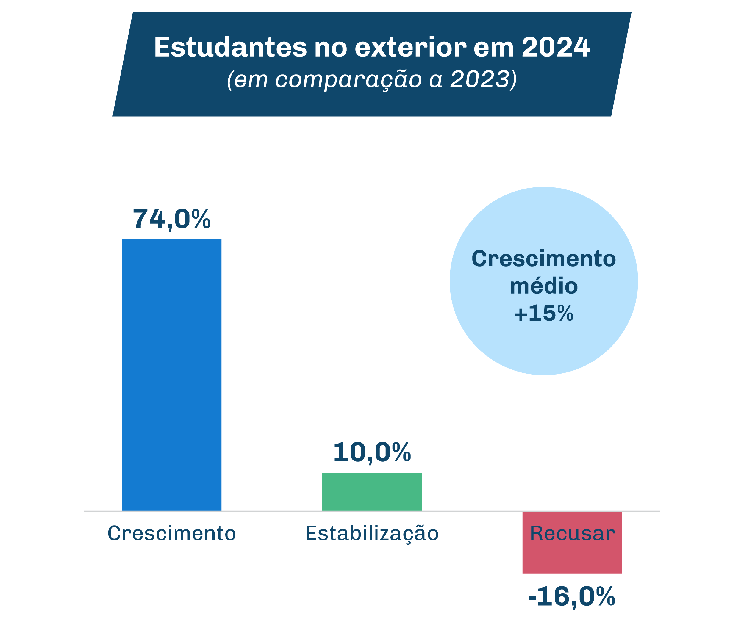 74% dos 586 agentes de intercâmbio brasileiros entrevistados pela Associação Brasileira de Agências de Intercâmbio (BELTA) entre fevereiro e abril de 2025 relataram um crescimento médio de 15% no número de estudantes no exterior em 2024, em comparação com 2023. Além disso, 80% deles esperam níveis de crescimento semelhantes para 2025, o que reforça a sustentabilidade do mercado.