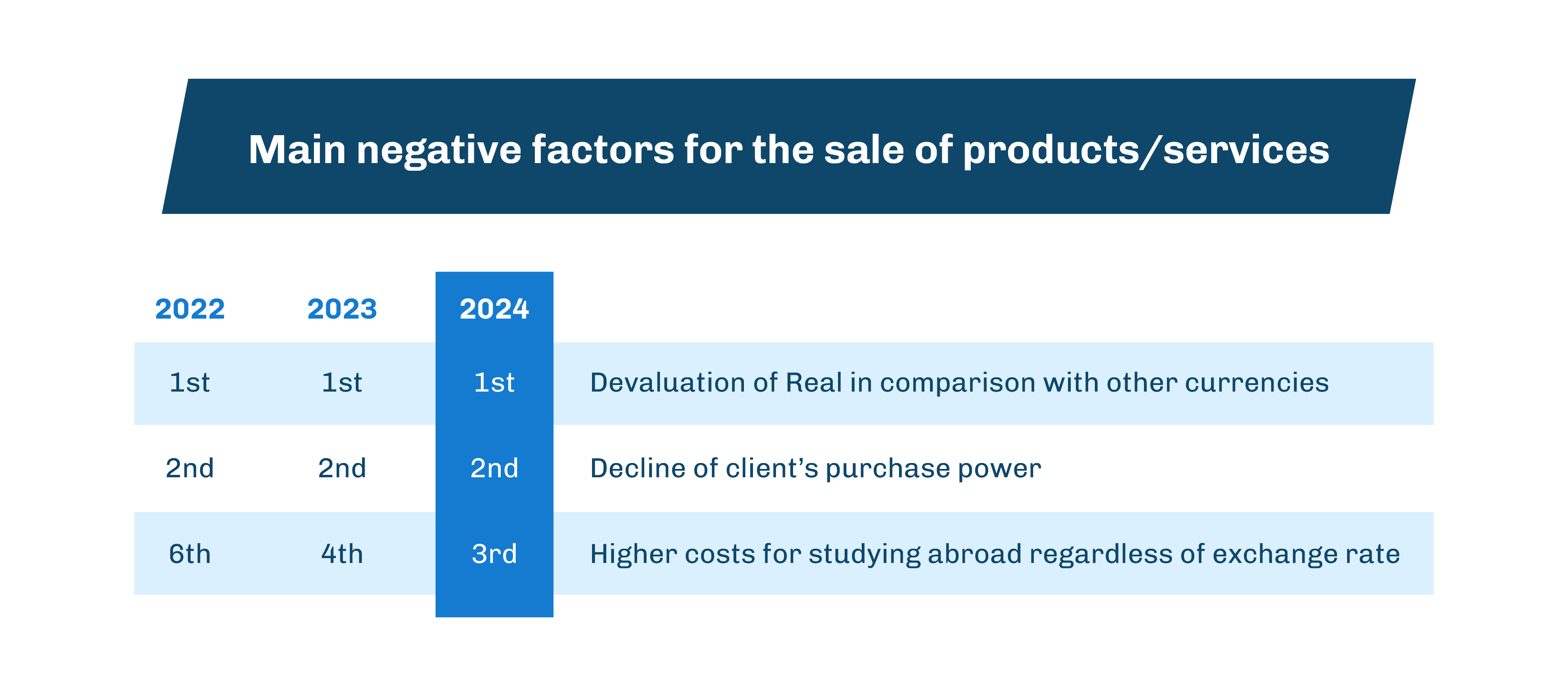 According to the BELTA report, the average investment made by clients wanting to study abroad is $7,238 USD, over ten times the Brazilian average annual income. What’s more, despite over half of the students surveyed hailing from the most affluent region of Brazil, financial issues still have an impact on agents’ ability to sell courses. The top three challenges they face are devaluation of the Real, declining purchasing power, and the higher cost of education abroad regardless of exchange rates.